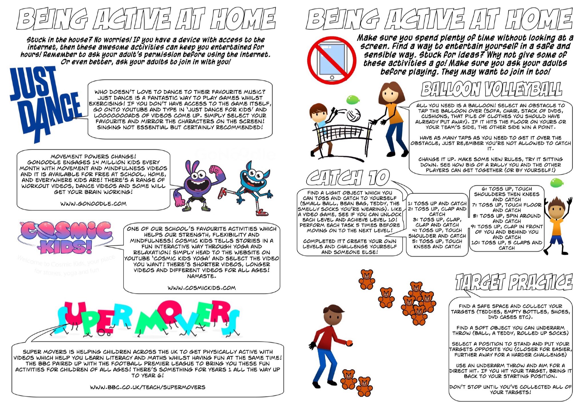 To keep active, have a look at ‘active at home’ ideas sheet and use the following links to access great resources to help you all get moving